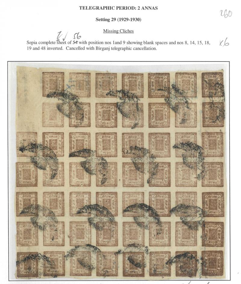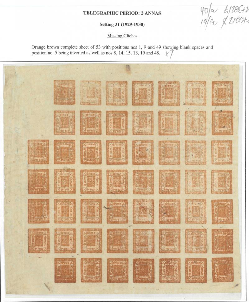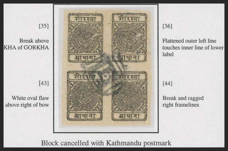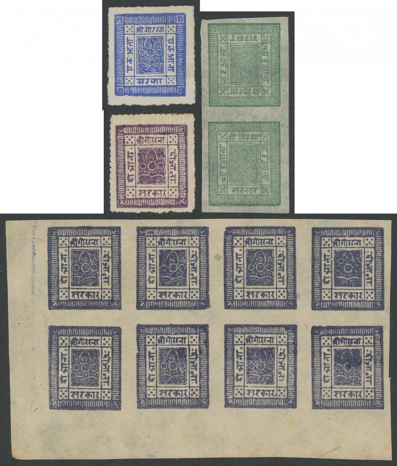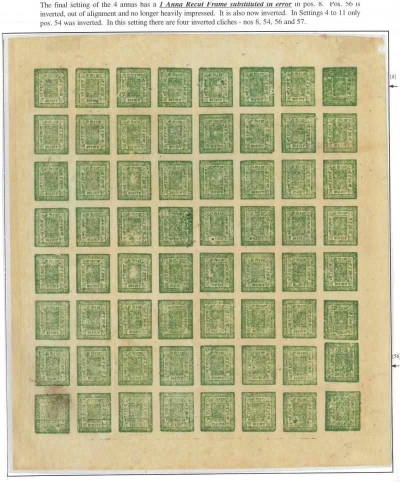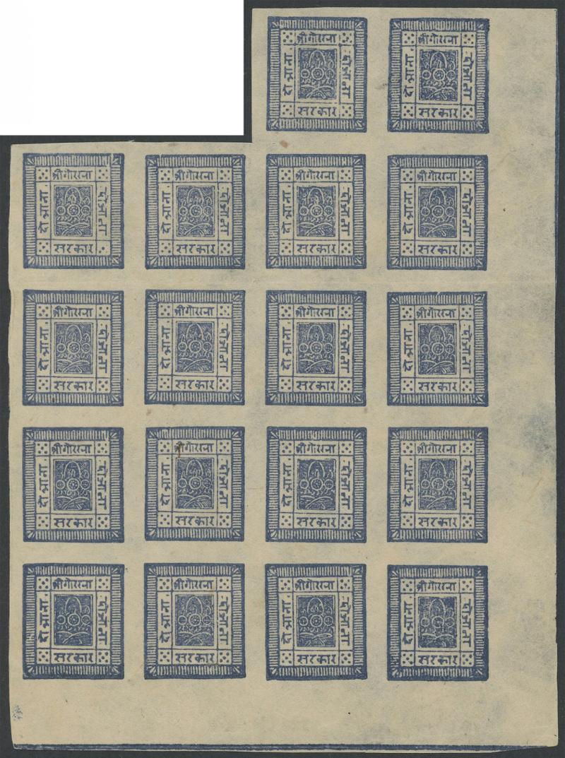 very fine, various crescent-cancels including full strikes of Birganj & Kathmandu and fancy-boxed cancel of Amlekhganj, then ½a black Stg 13 complete sheet of 64 (8x8) with six horizontal or vertical Tete-Beche Pairs SG 34a, 1a dull ultramarine Stg