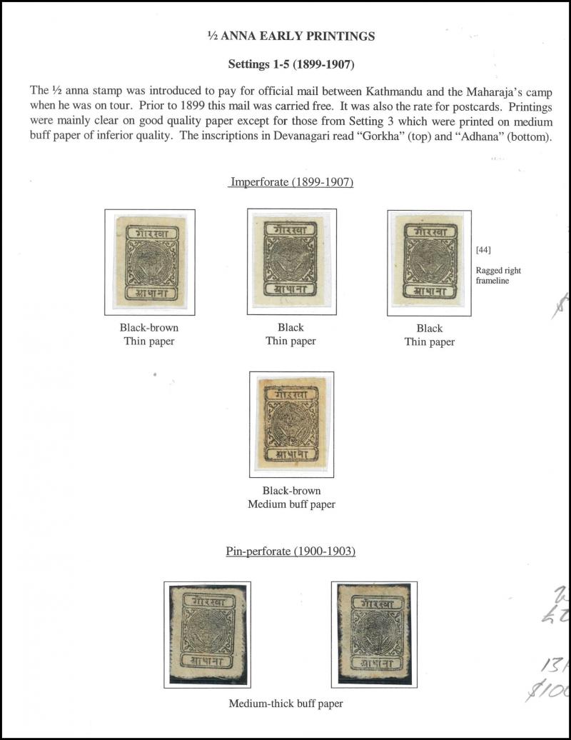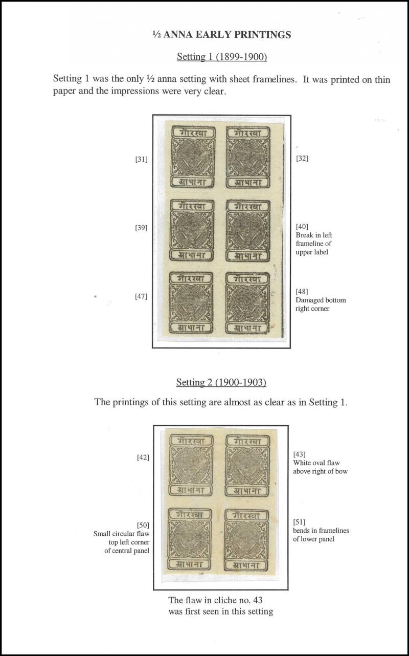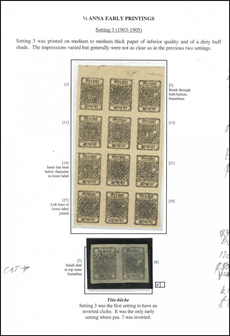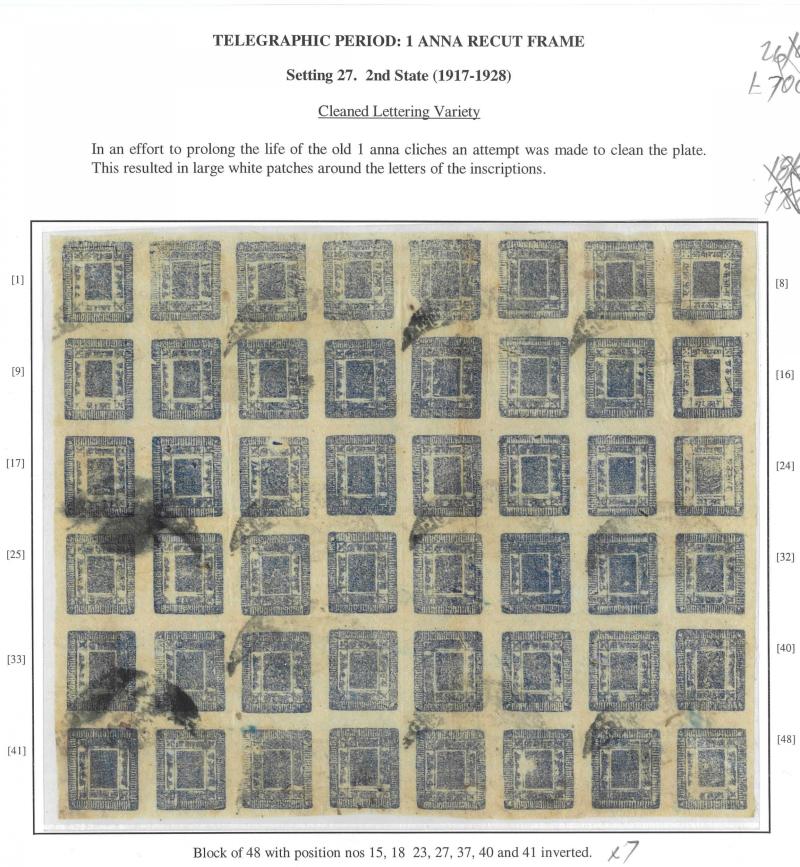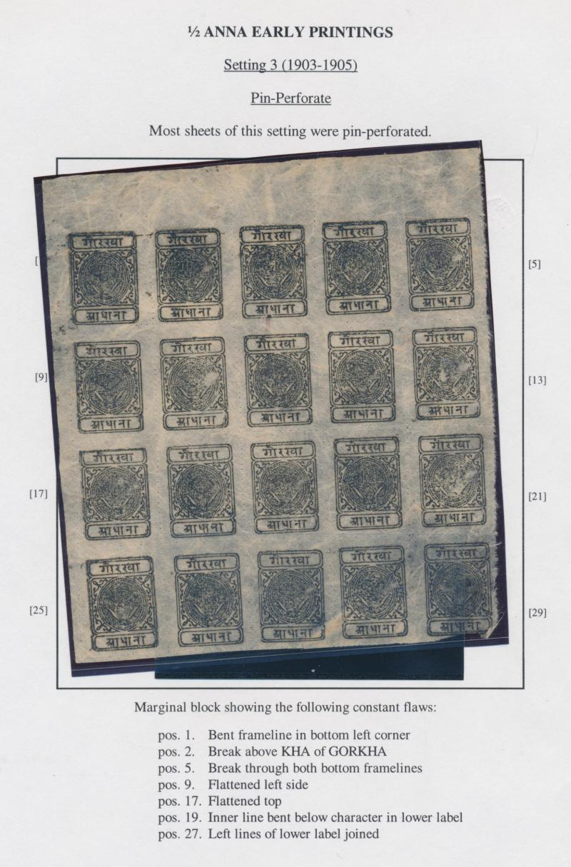 very fine, various crescent-cancels including full strikes of Birganj & Kathmandu and fancy-boxed cancel of Amlekhganj, then ½a black Stg 13 complete sheet of 64 (8x8) with six horizontal or vertical Tete-Beche Pairs SG 34a, 1a dull ultramarine Stg