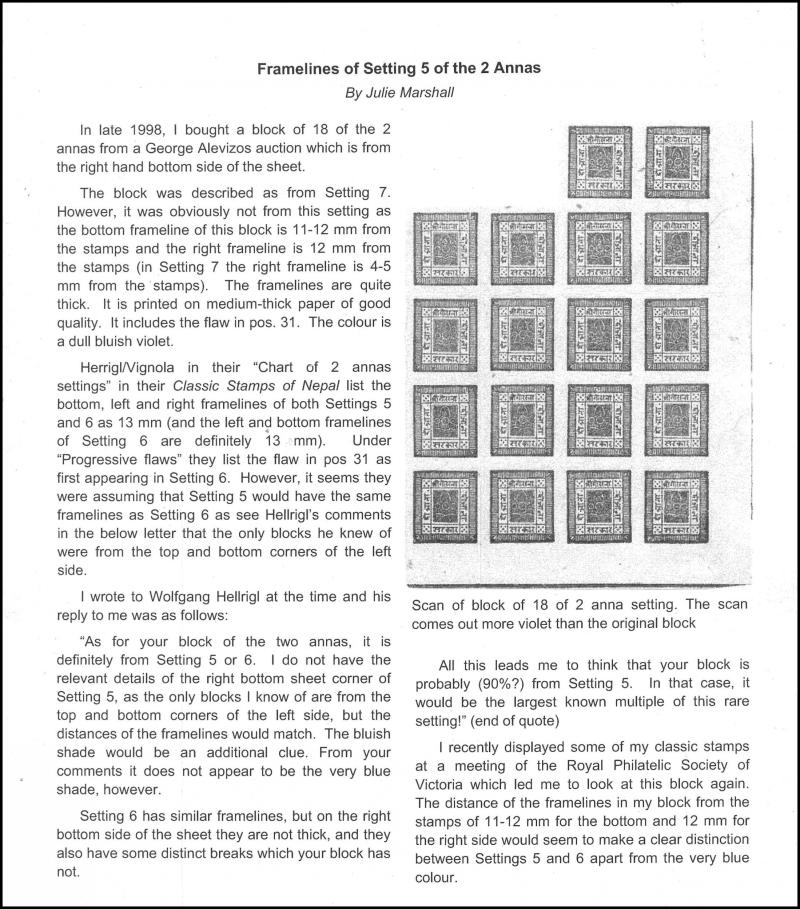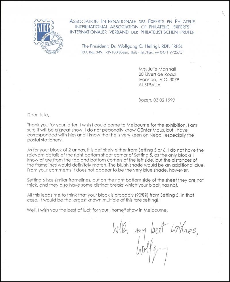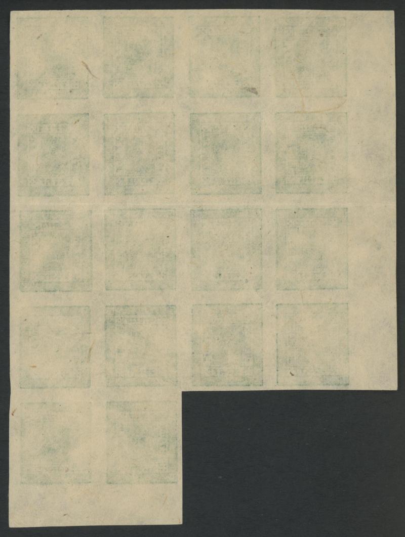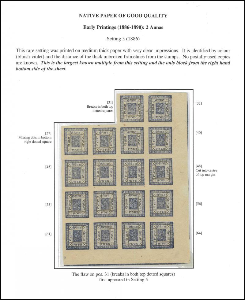 Hellrigl: "...the only blocks I know of are from the top and bottom corners of the left side...your block is probably (90%) from Setting 5 [and] the largest known multiple of this rare setting!!" In their book, Hellrigl & Vignola state at page 127
