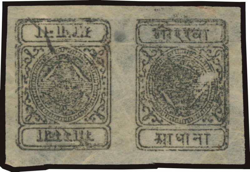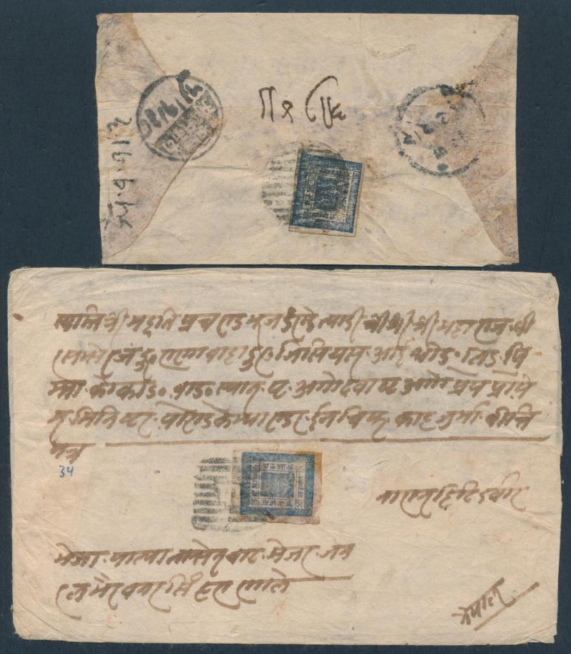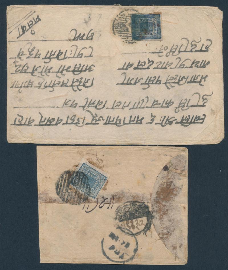 superb seal on the reverse of Amini Goswara, with fine strike of the first Kalaiya postmark inscribed 'BARA', the other with superb strike of the first Hanumannagar postmark with manuscript date & fine strike of the first type Kathmandu arrival