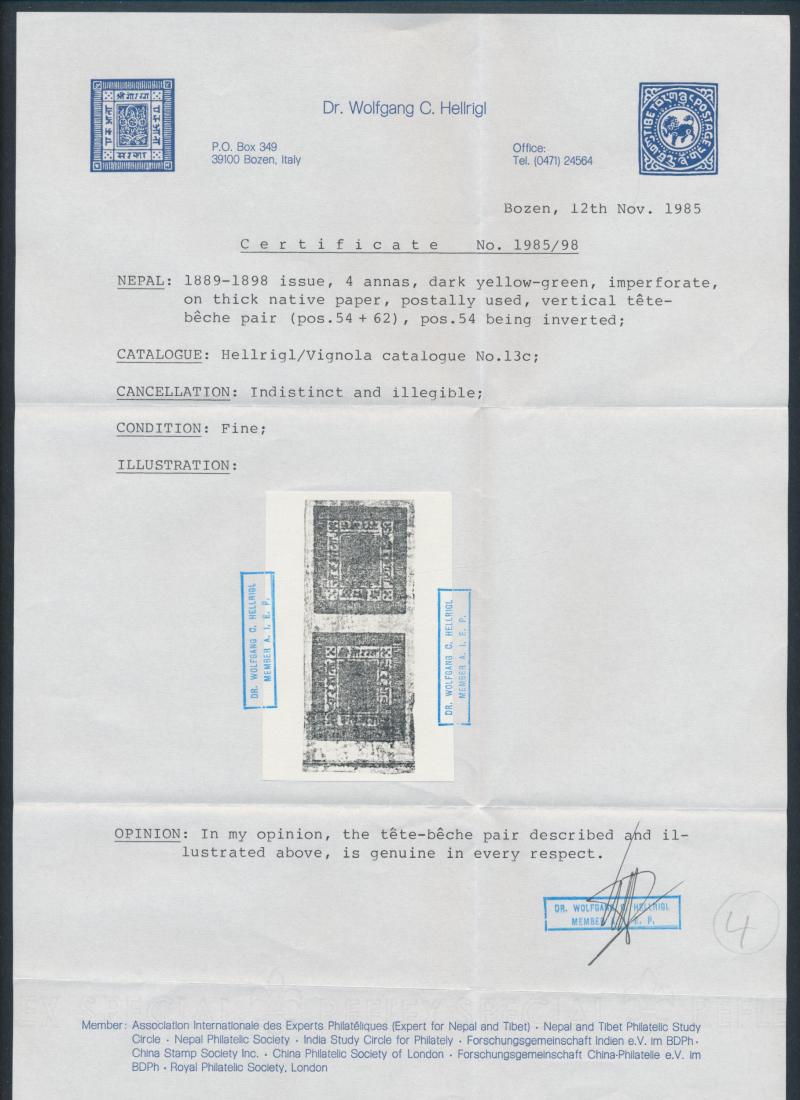 fair strike of Dhankuta's character-in-bars cancel with superb intaglio cds to the right with manuscript date; 1897 larger-than-usual cover with an Imperf 1a blue tied to the face by a fine strike of Palpa's character-in-bars cancel, on the reverse a