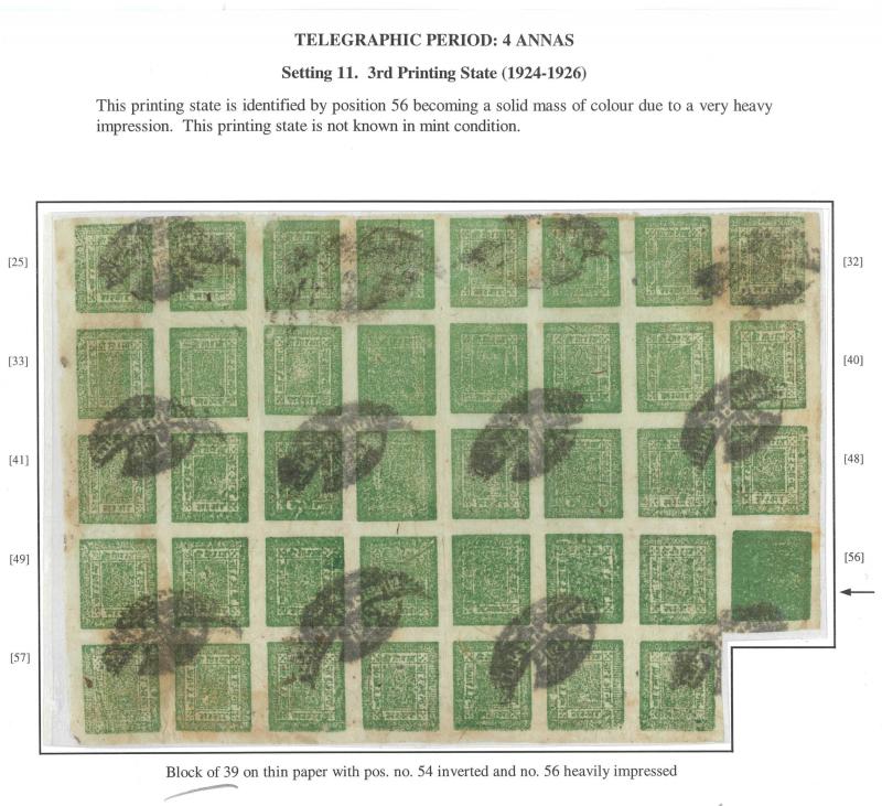 of 56 with three blank positions & seven Tete-Beche Pairs, 4a green selection with a horizontal Tete-Beche Pair [53-54], blocks of 4 9 & 15, and from the Third State a block of 39 (8x4, missing the lower-right unit), and 4a bright green SG 41 Setting