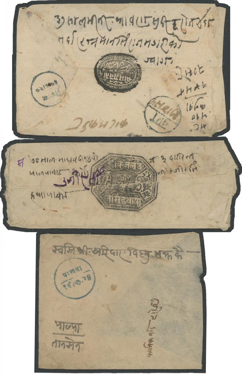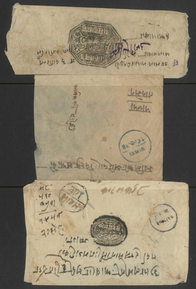 large-part cover from Kathmandu endorsed on the reverse "Mahasul Chukti" (= postage fee paid), to Palpa with very fine first type datestamp; 1880 two covers to the Prime Minister & Commander-in-Chief Rana Udip Singh Bahadur, the first with largely