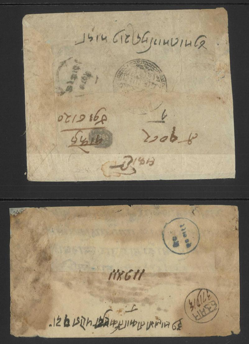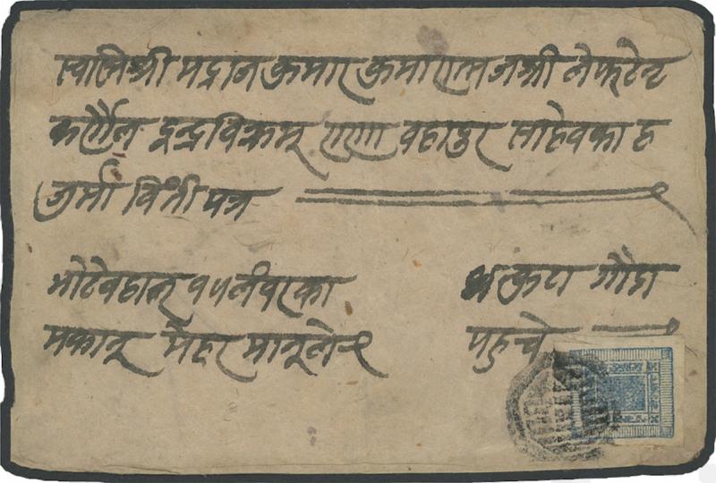 light but clear intaglio cds of Palpa with manuscript date; 1900 larger-than-usual cover with an Imperf 1a blue tied to the face by a largely very fine strike of Gahawa's character-in-bars cancel, on the reverse a largely fine intaglio cds of Gahawa