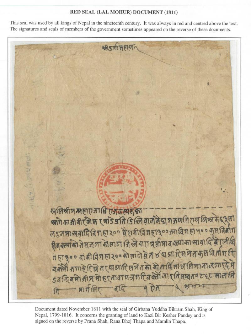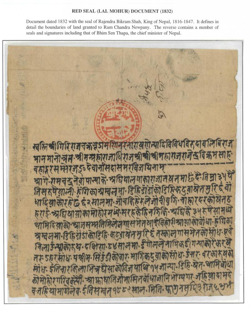 Yuddha Bikram Shah (King of Nepal 1806-1816) or Rajendra Bikram Shah (1816-47) in vermilion; 1821 cover with superb seal on the reverse of Uzir Singh Thapa, Governor of Palpa, to his uncle, Prime Minister Bhim Sen Thapa in Kantipur (Kathmandu); 1879