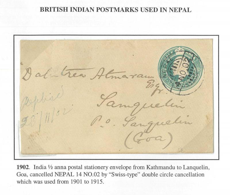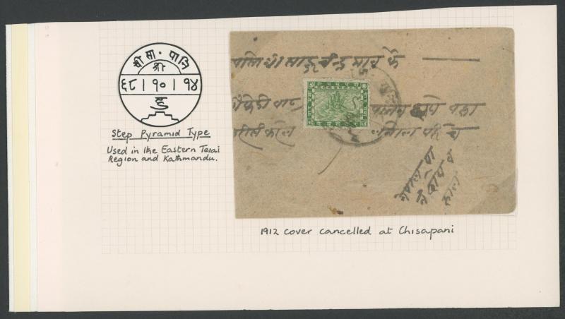 Commanding Officer/9th B.I." with a superb strike of the scarce 19mm 'thimble' cds inscribed 'NFPAL/JA2/91', faults; 1904-07 covers x3 & postal stationery Envelopes x4 with all-different 'NEPAL' postmarks comprising Swiss bridge-pattern cds x2 (one
