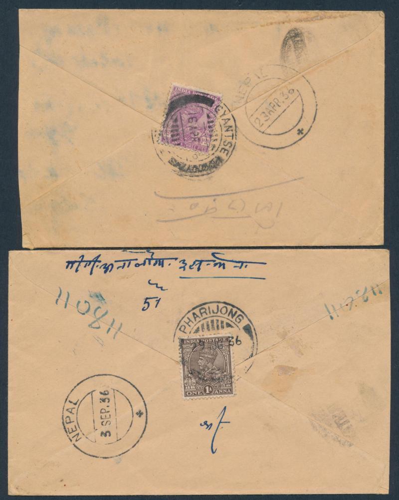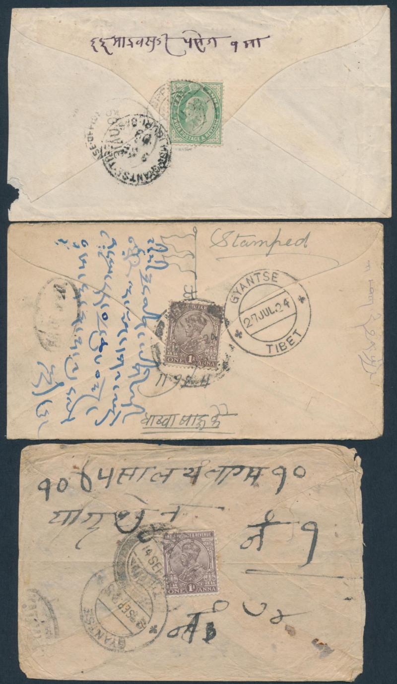1920 from Kathmandu to "Lhassa/co Pancha Ratna/...Gyanchi Tibet" with fine 'GYANTSE/27SEP23/TIBET' arrival; 1924 with 1a tied by 31mm 'NEPAL/10JUL24' cds & superb 32mm 'GYANTSE/27JUL24/TIBET' arrival; 1936 two covers to Kathmandu with 1a3p tied to