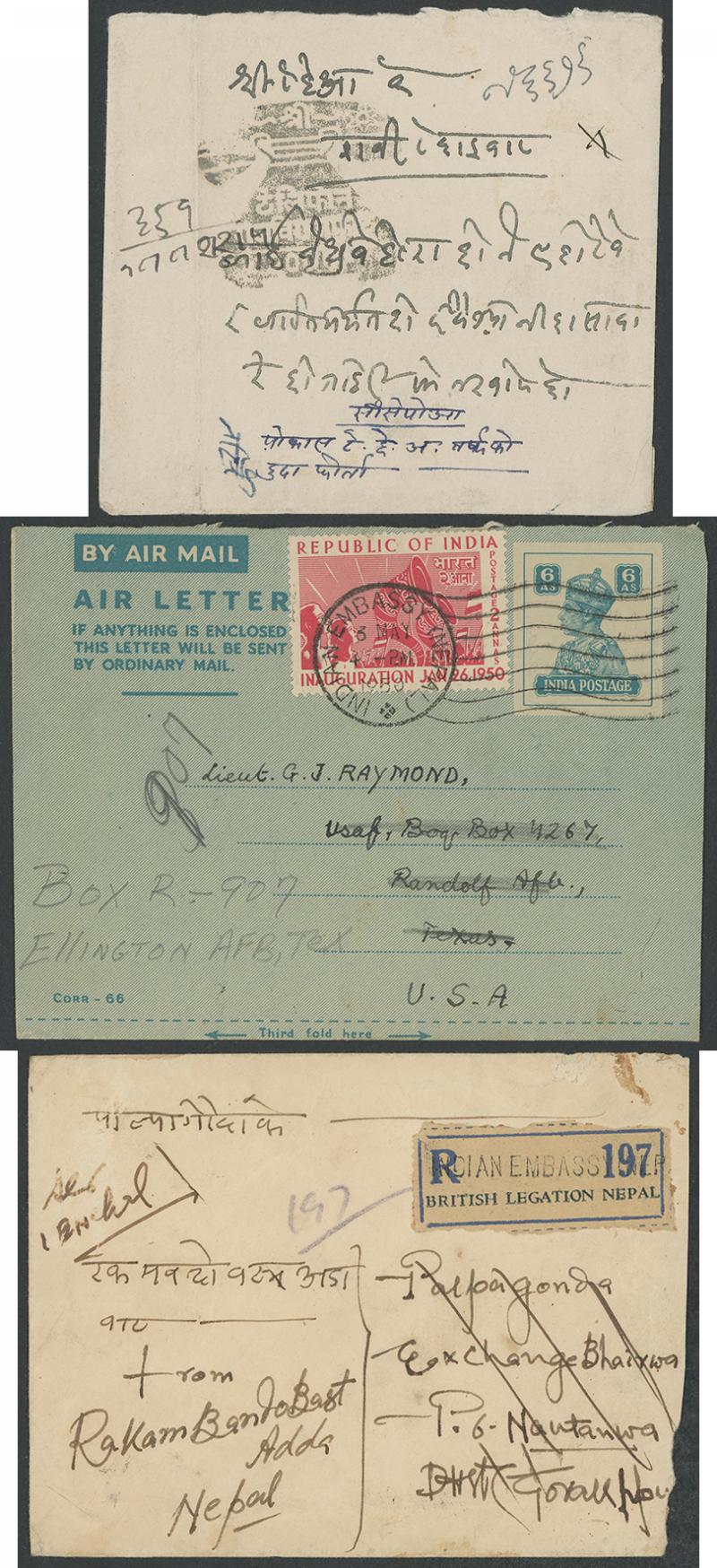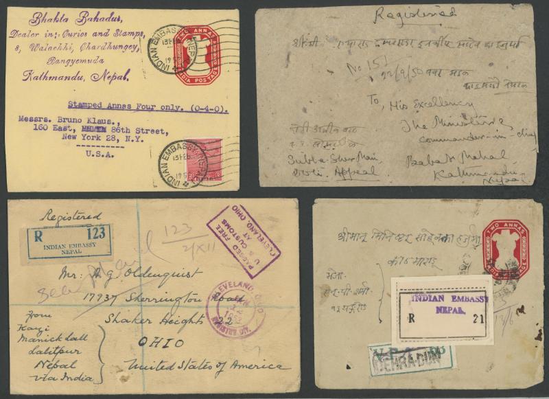 provisional R label, 1950 uprated 6a Aerogramme with full letter to Texas & 1952 uprated 2a Envelope to New York with 'INDIAN EMBASSY (NEPAL)' so-called 'comet' cancels, 1950 uprated 2a Envelope from Dehra Dun & cover from Jhulaghat both registered