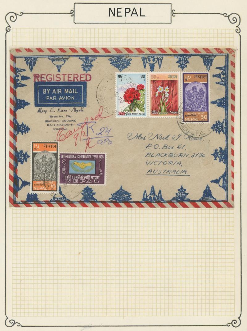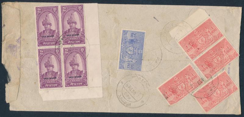 registered letter also with 'NEPAL'-in-Box handstamp, Registration Receipt and 'A.R. Receipt for Inland or foreign Telegrams'; generally fine.