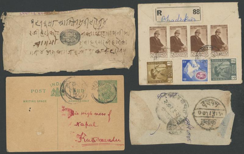 year; month before day), 1881 unpaid & taxed from India with very fine 'NEPAL/1 FEB:' cds (no year; day before month), a batch of prestamp or unstamped covers with a variety of seals &/or postmarks, KGV & Sri Pashupati groups, post-WWII commercial