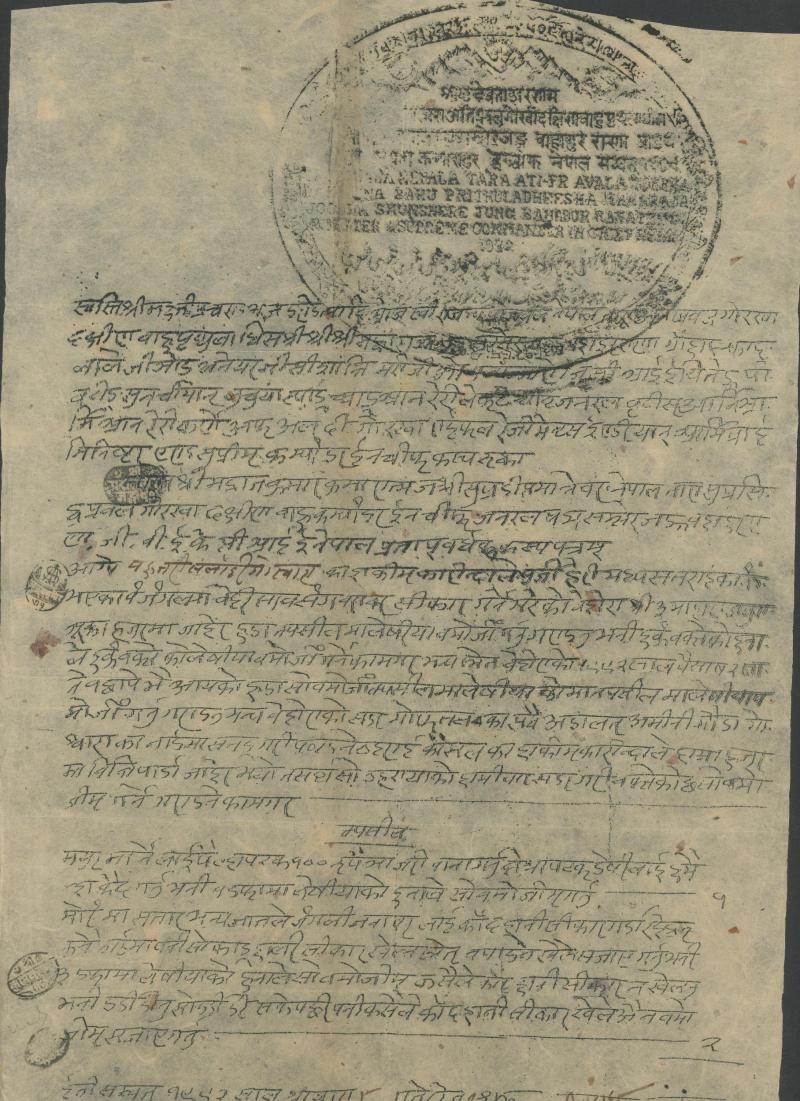 mute-circle with manuscript endorsement of "Rasuwa/16.4.1903" & intaglio cds of Trisuli; 1907 official from Kuti with very fine elaborate court seal, manuscript of Tatapani & intaglio of Chuatara (an unusually late usage of the traditional route,