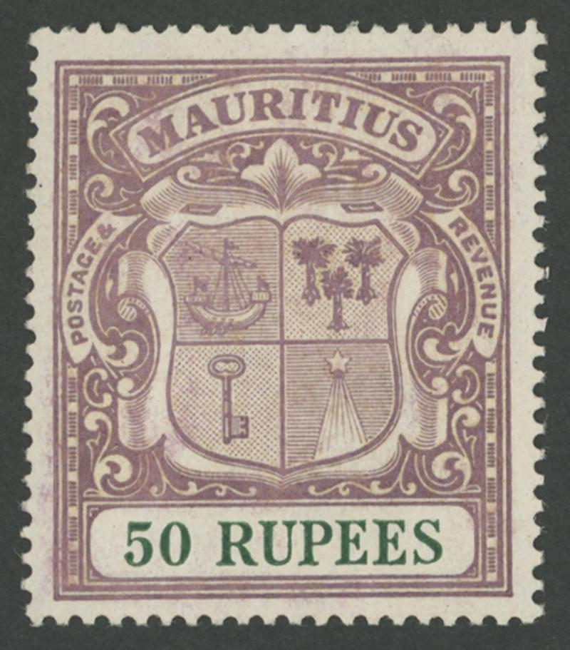 1921-26 Arms Multiple Script CA Watermark 50r dull purple & green SG 222, very lightly mounted, Cat £950. (Image1) (Image2)