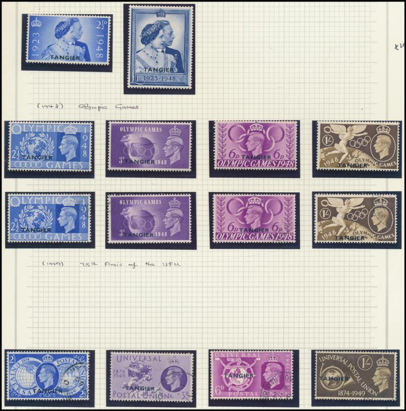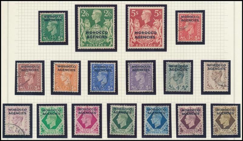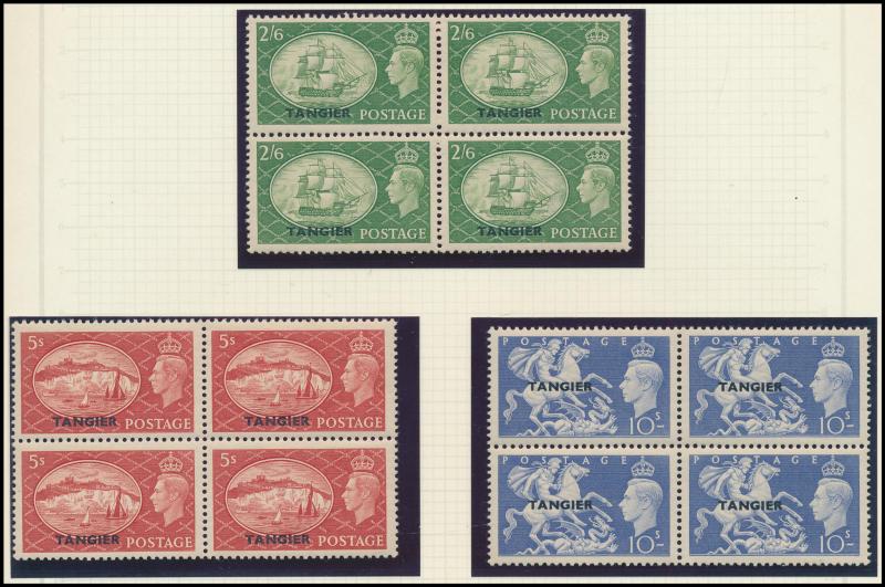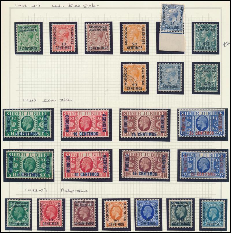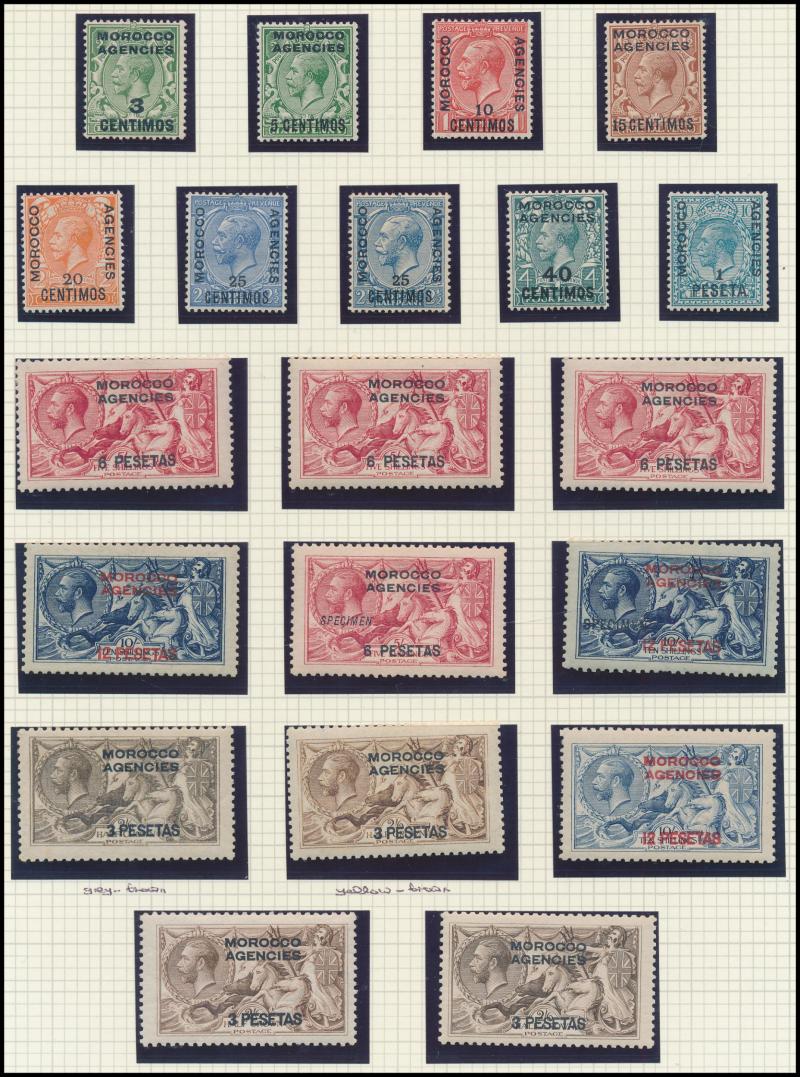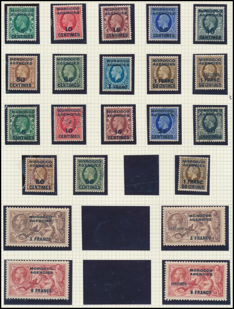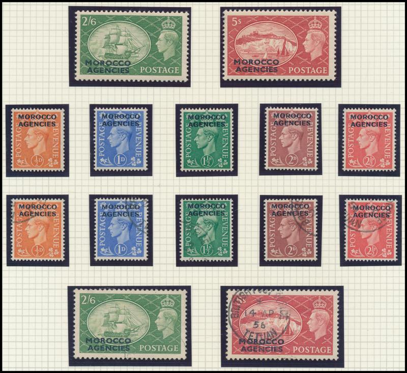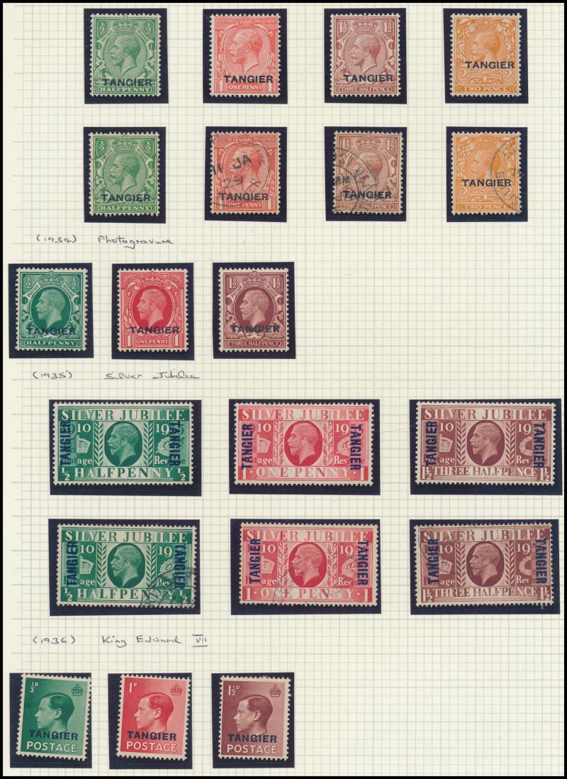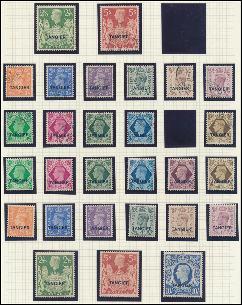 apparently complete * plus many used and 'SPECIMEN' overprints KGV 1/- (both) & Seahorses duo, also Tangier reasonably complete to 1950 * plus many used including 1949 KGVI set (ex 11d) with Tangier cancels and 1950 2/6d, 5/- & 10/-, 1953 QEII