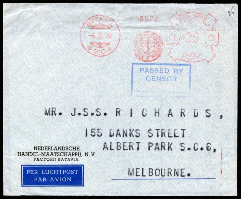 1939 Nederlandsche Handel-Maatschappij NV shipping line cover airmail to Australia with 'BATAVIA/-6.9.39' 25c meter cancel, carried