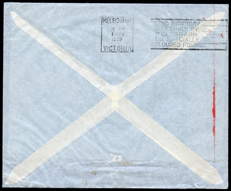 by Imperial Airways Flying Boat Cambria with Melbourne '12SEP' arrival backstamp, censored on arrival with early Melbourne boxed 'PASSED BY/CENSOR' cachet (without 'V'). (Image1) (Image2)
