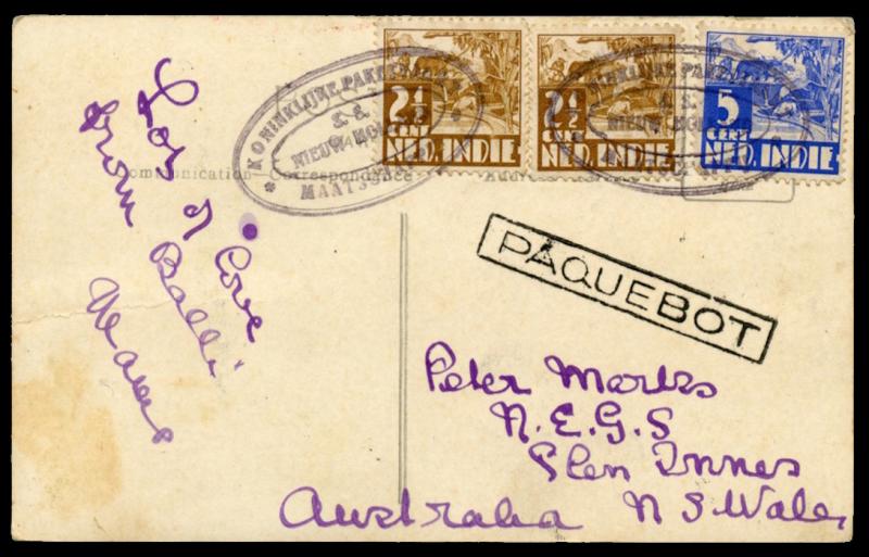 PAKETVAART/S.S./NIEUW HOLLAND/MAATSCHAPPIJ' undated ship cachets, on arrival at Townsville boxed 'PAQUEBOT' h/s (Hosking #1526) applied alongside, a few blemishes. (Image1) (Image2)