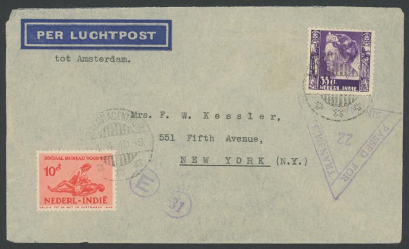 tied by 'BATAVIA-CENTRUM' cds, carried via Singapore with 'PASSED FOR/TRANSMISSION/22/...' triangular handstamp, and Bangkok with 'E' & '31'-in-circle cachets, then presumably by Imperial Airways feeder service to Hong Kong and PanAm FAM-18 China