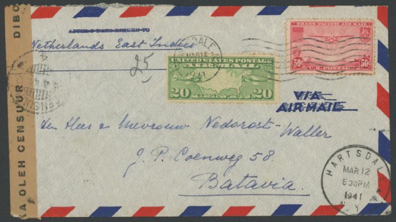 1941 (March 12) inwards airmail to Batavia with USA Airmails Map 20c green & China Clipper 50c red tied by Hartsdale, NY machine