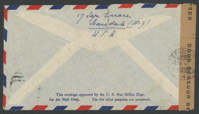 cancel, censored on arrival with black/brown resealing label tied by 'CENSUUR/4.4.41/ 4 ' cds, minor blemishes. The rate was 70c per ½oz for PanAm Pacific Clipper FAM-19 to New Zealand, TEAL to Australia and Qantas/KNILM to destination. (Image1) (Image2)