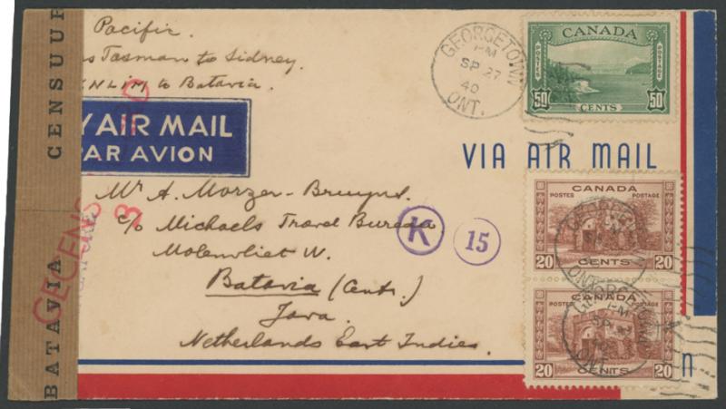 1940 (Sept 27) inwards airmail to Batavia from Canada endorsed "Via Pacific, Trans Tasman to Sidney [sic], KNILM to Batavia" with