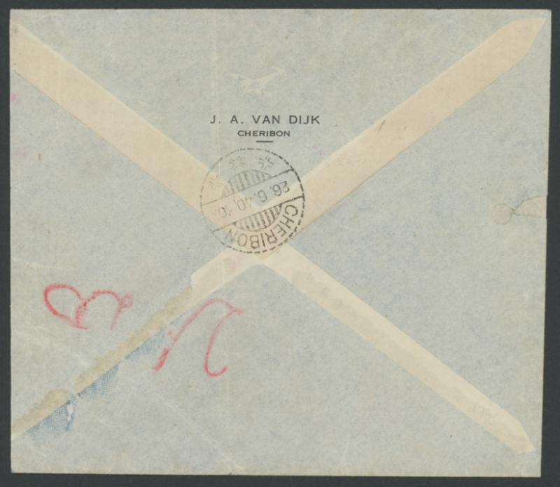 carried as far as Bangkok with '5'-in-circle censor cachet in violet on the face, but then 'RETOUR AFZENDER/POSTVERBINDING OPGEHEVEN' in magenta on the face and 'CHERIBON/ 26.6.40' return backstamp, light central fold clear of the stamps & a few tiny