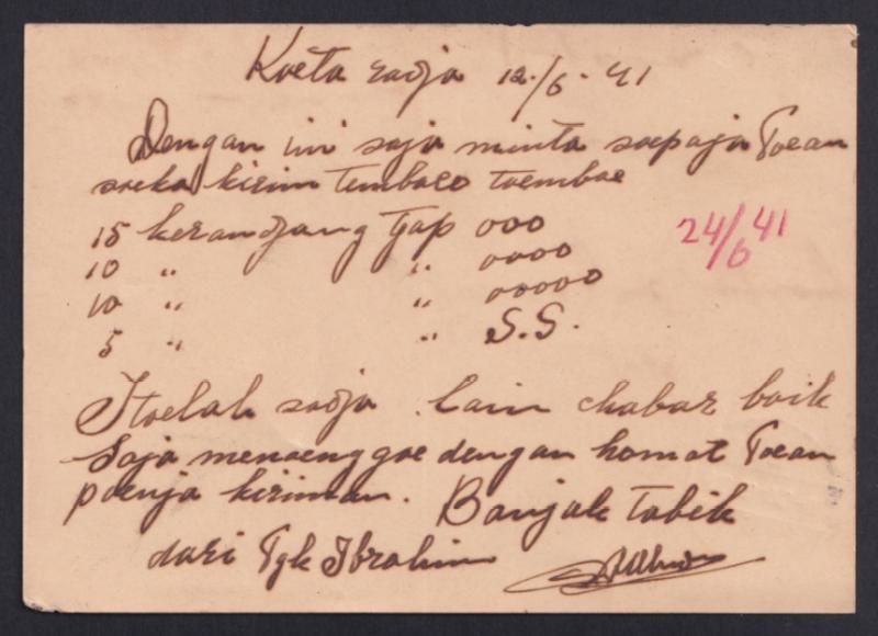 1941 (June 13) Postal Card Scenes 3½c grey to Wonosobo, Java with 'KOETARADJA' cds and very fine strike of 'Militaire
