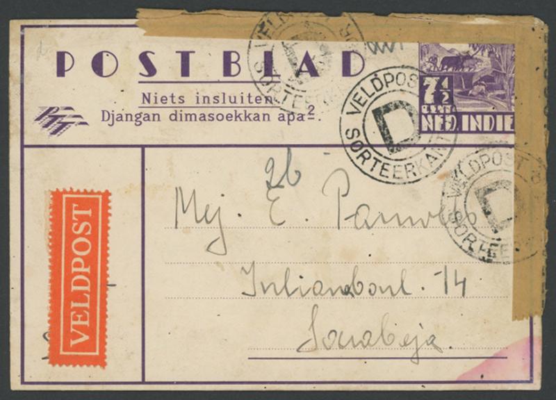 1941 (circa) 'POSTBLAD' Aerogramme Scenes 7½c violet (complete) to Soerabaja with white/orange 'VELDPOST' label, censored with