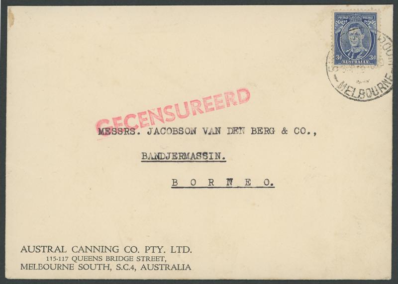 1940 (Aug 6) Austral Canning Co envelope to Bandjermassin Borneo with Australia KGVI 3d blue solo tied by Melbourne cds cancel,