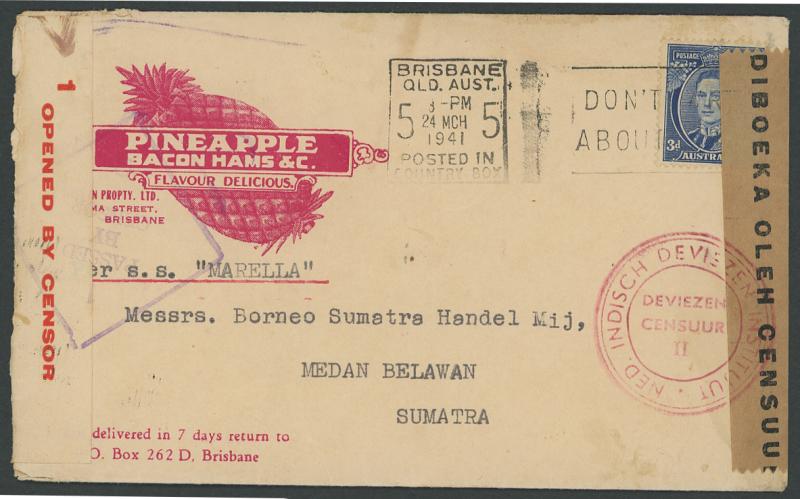 with Australia KGVI 3d blue solo tied by Brisbane 'DON'T TALK/ABOUT SHIPS' machine cancel, censored locally with Brisbane resealing label and also in the Netherlands Indies with 'NDE.INDISCH DEVIEZEN INSTITUUT' [currency control] handstamp in