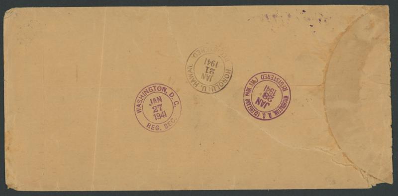 tied by Batavia cds cancel and black & red/white R label alongside, official cachet at lower-left, not censored, Honolulu transit and Washington 'JAN/27/1941' arrival backstamps, a few light folds & minor edge faults. Carried by KNILM to Manilla and