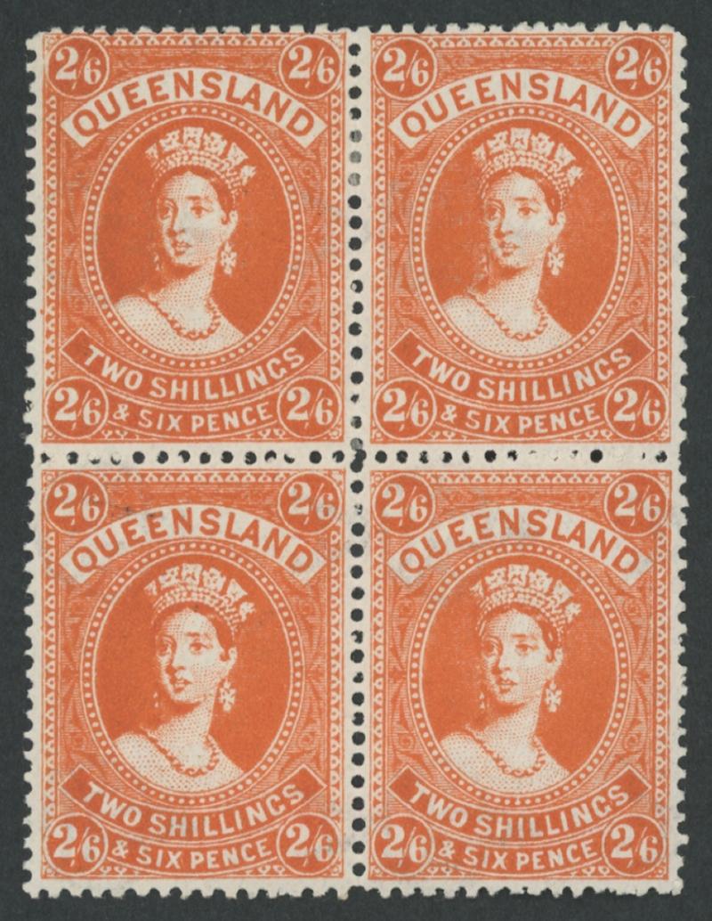 1907-11 QV Large Chalons Small Crown/A Watermark 2/6d bright vermilion ACSC Q55A (SG 309) block of 4, well-centred, the lower units