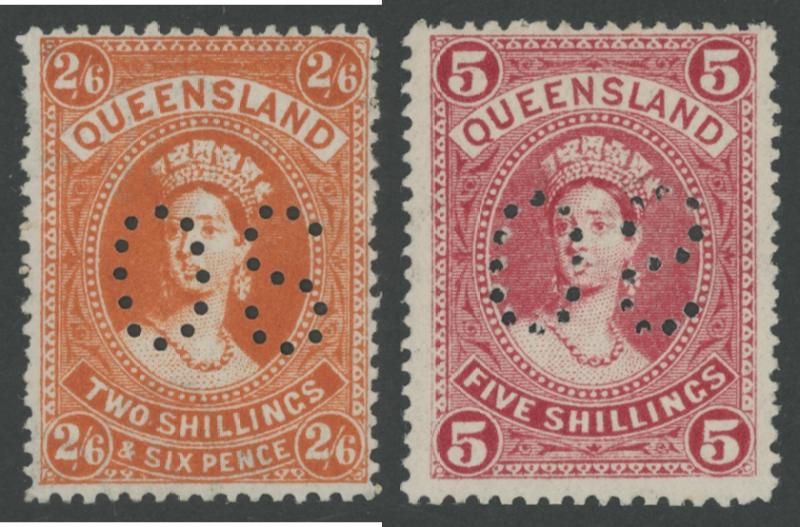 OFFICIAL STAMPS: 1907-11 QV Large Chalons Small Crown/A Wmk 2/6d dull orange and 5/- rose (perfin reversed) both punctured 'OS'
