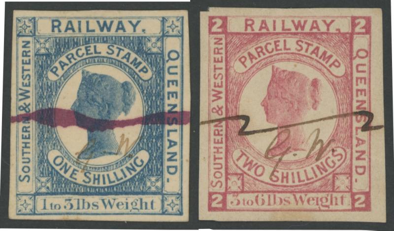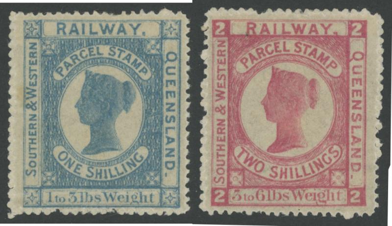 RAILWAY STAMPS: 1867 Southern & Western Railway QV Perf 13 1/- blue & 2/- carmine-rose, characteristic uneven perfs, the 1/- with a