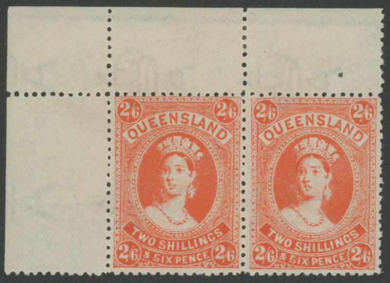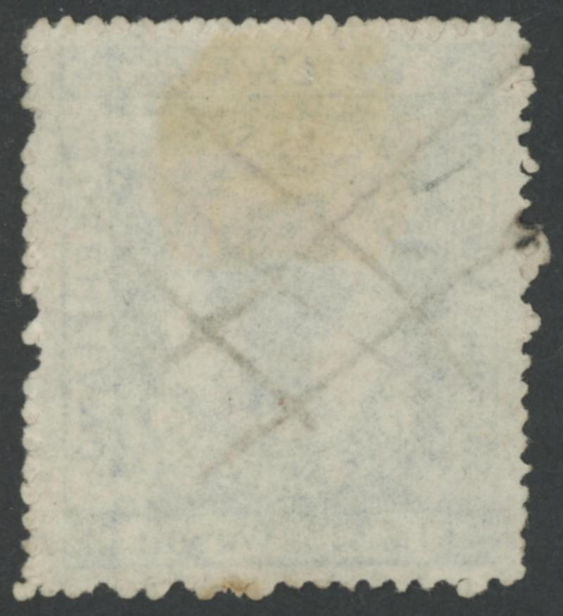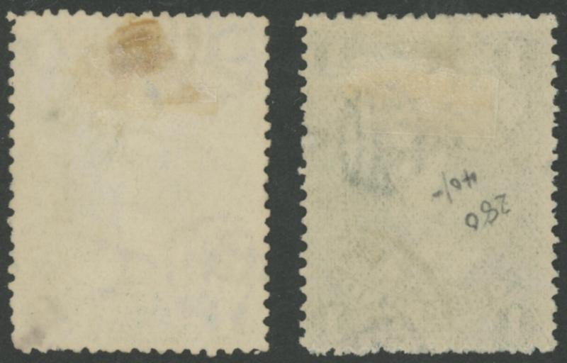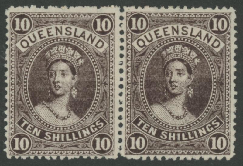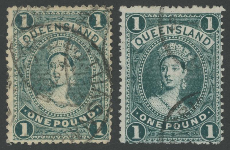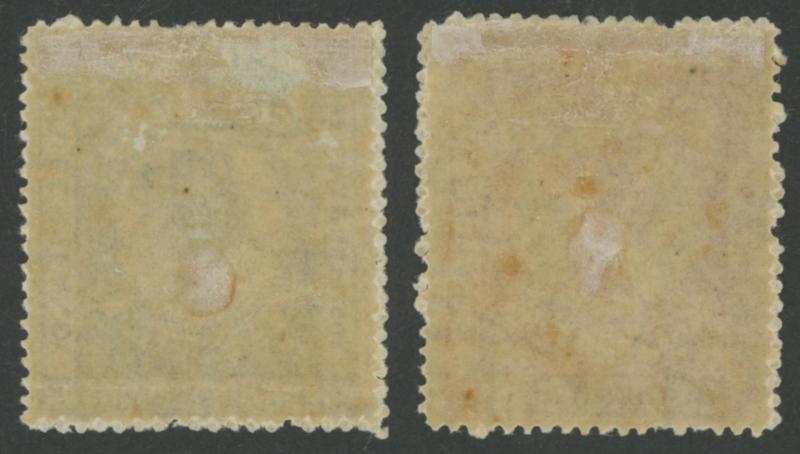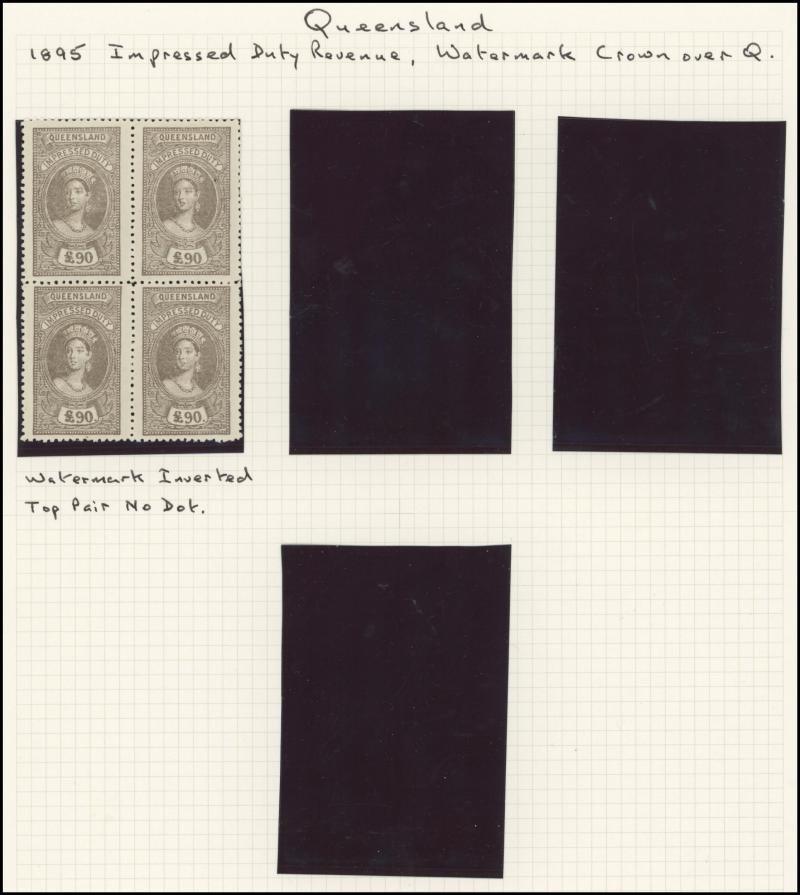 Crown/Q watermarked paper ACSC Q43(E)1Bd & e, defaced with ruled ink-lines in black, Cat $8000+ for singles. Unissued design. Ex William Knight, JH Chapman and Colonel Harrie Evans: these plus a pair in yellow-orange sold for $6225 (Sale 96 Lot 510).