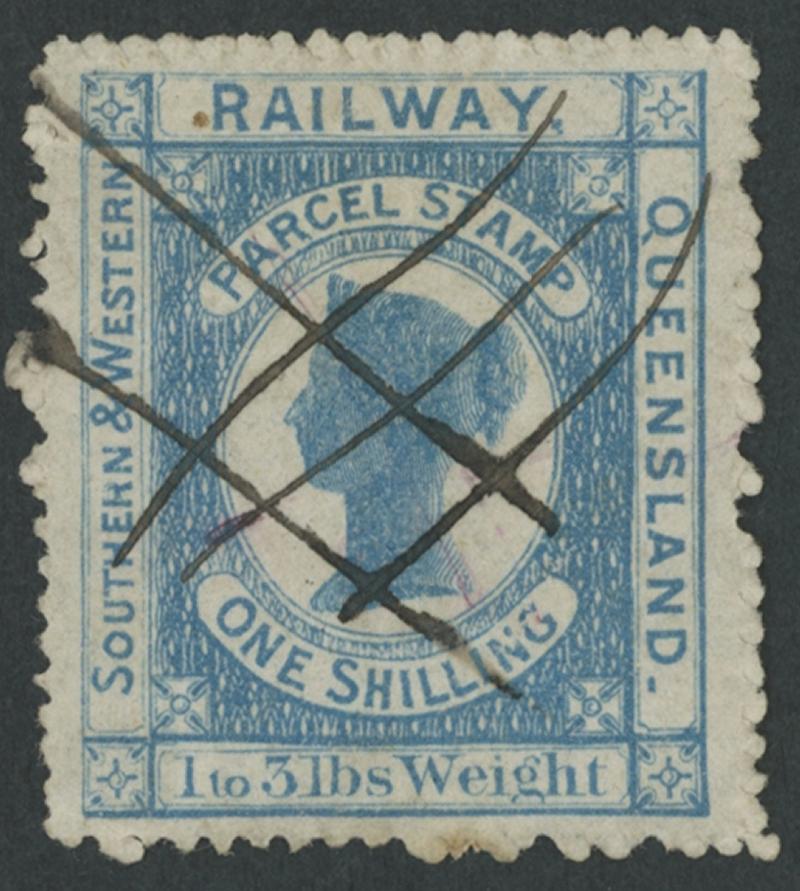 RAIWAY STAMPS: 1867 Southern & Western Railway QV Perf 13 1/- blue, characteristic irregular perfs, manuscript overlapping lines