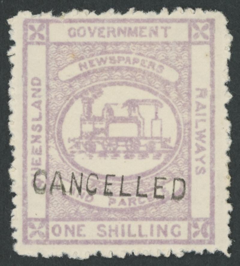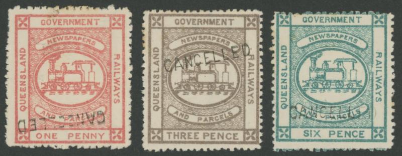 RAILWAY STAMPS: 1896 New Locomotive Design Large Crown/Q Wmk 1d 3d 6d & 1/- each with 'CANCELLED' handstamp in black,