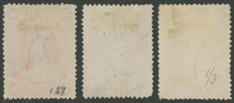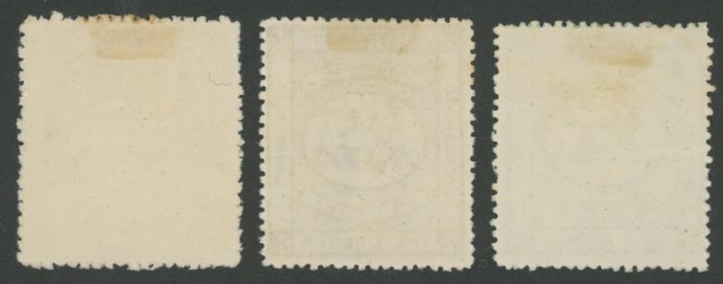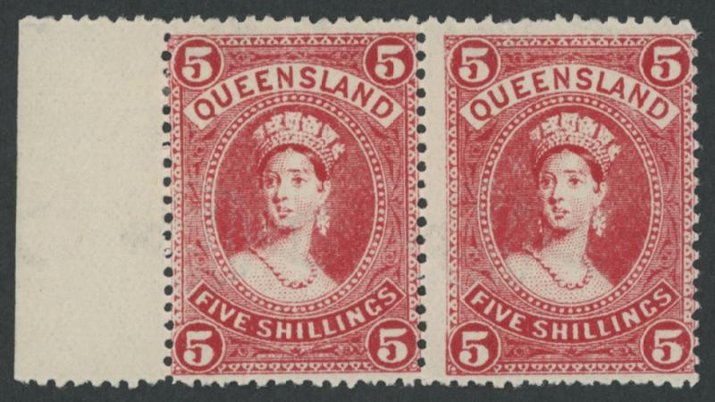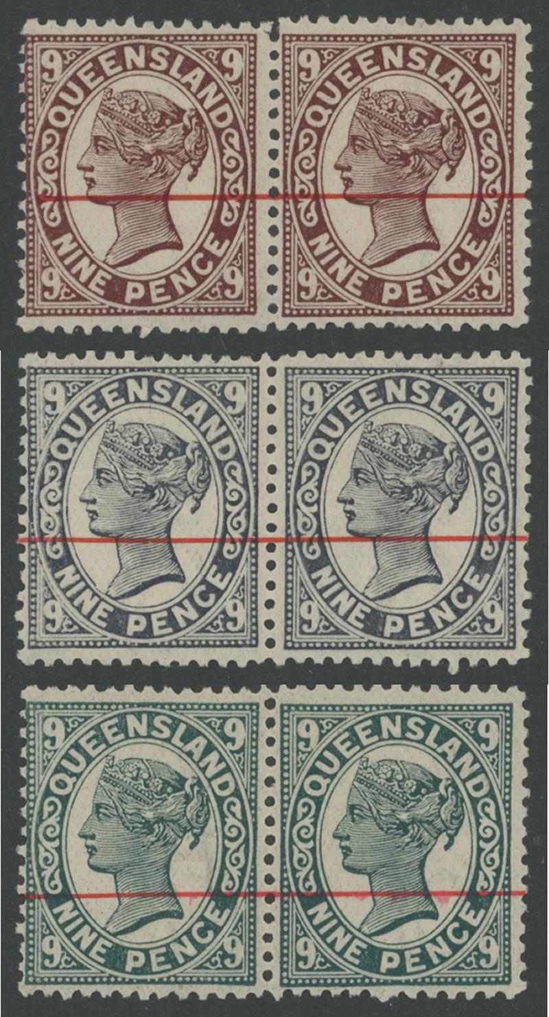 myrtle-green on gummed Crown/Q watermarked paper ACSC Q43(E)1Ba b & c, defaced with ruled ink-lines in red, Cat $12,000+ for singles. Unissued design. Ex William Knight, JH Chapman and Colonel Harrie Evans: sold for $7075 (Sale 96 Lot 509). (3