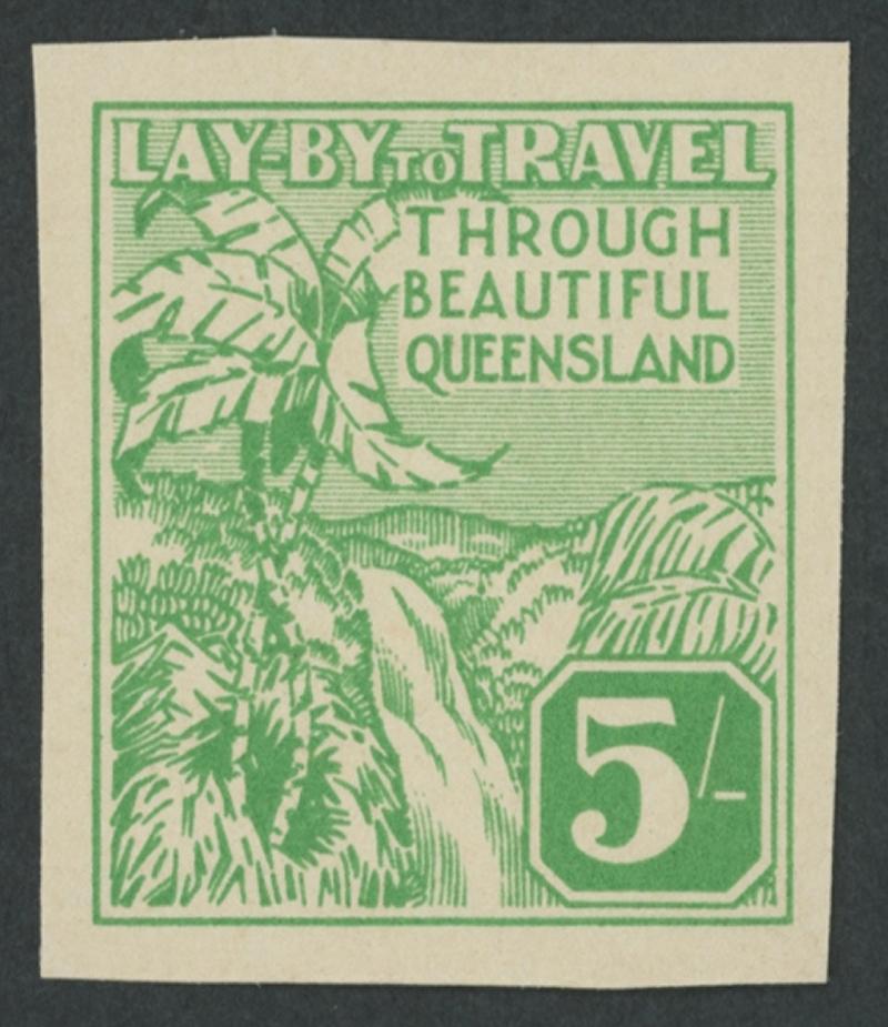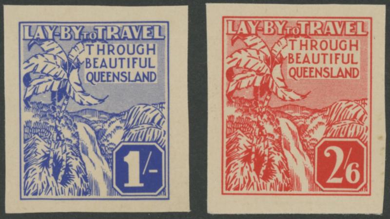 RAILWAY STAMPS: 1940 'LAY BY TO TRAVEL/THROUGH/BEAUTIFUL/QUEENSLAND' (banana tree & waterfall) 1/- blue, 2/6d scarlet & 5/- emerald