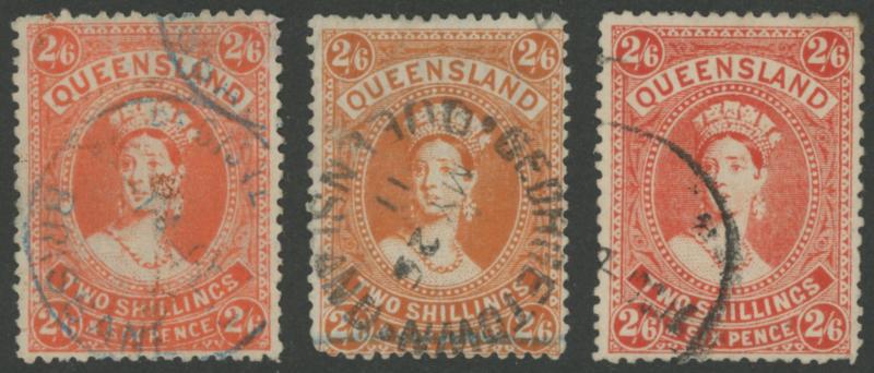 1907-11 QV Large Chalons Small Crown/A Watermark 2/6d vermilion (unmounted), 5/- deep rose (lightly mounted) and 10/- black-brown