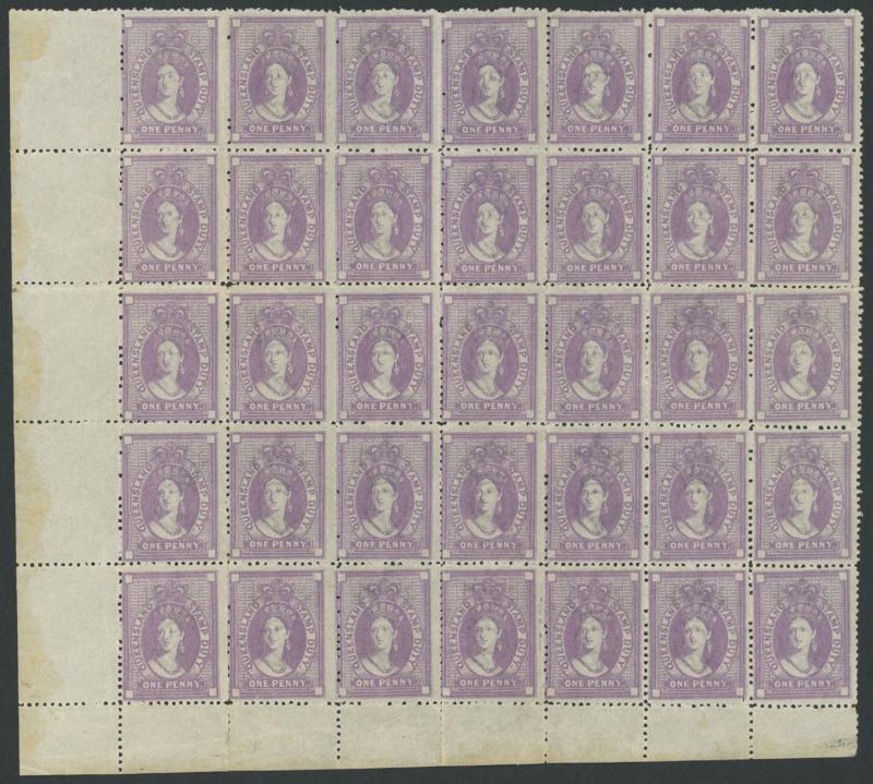 POSTAL FISCALS: 1871-72 QV Chalons Smaller Designs with Large Crown/Q Wmk 1d mauve SG F16 lower-left corner block of 35 (7x5),