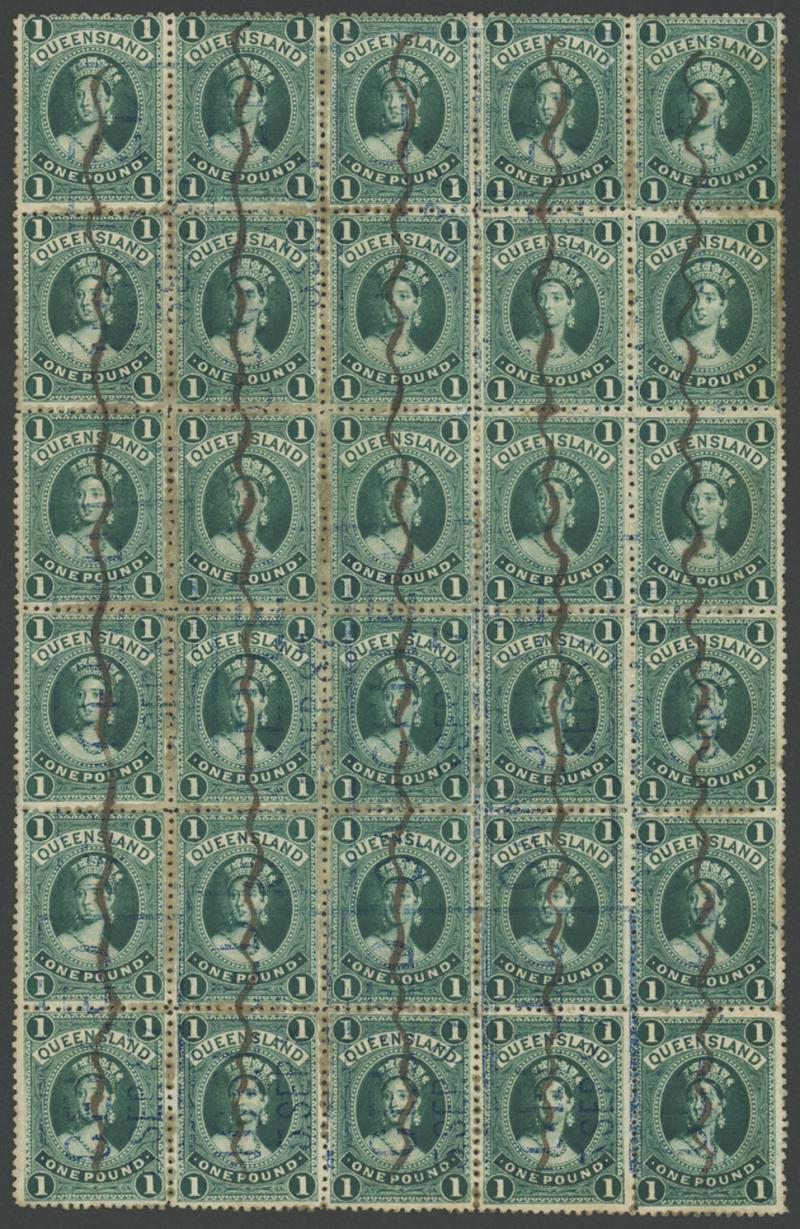 1886-1906 QV Large Chalons on Thick Beer Duty Paper with Large Crown/Q Wmk £1 deep green SG 161 complete sheet of 30 without