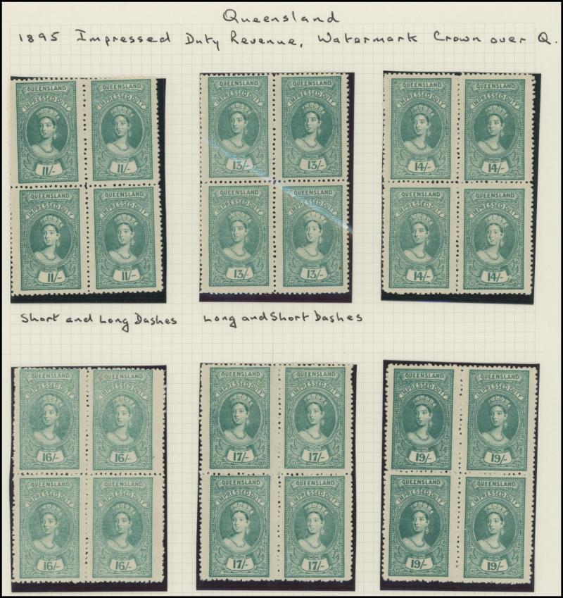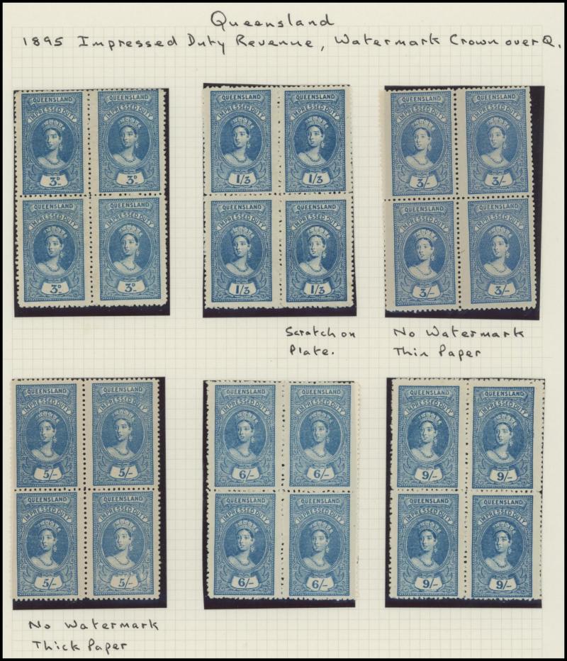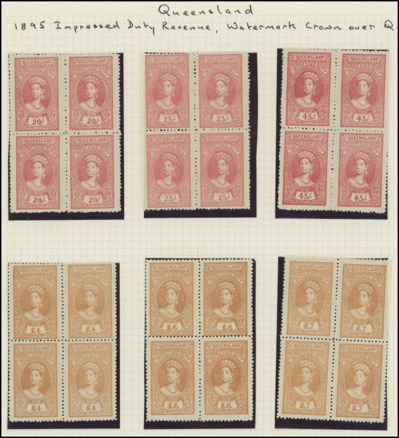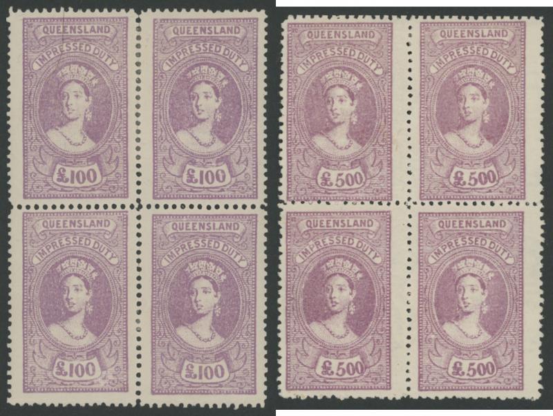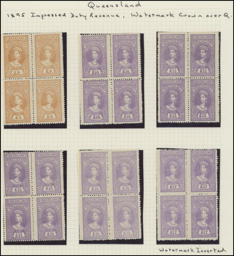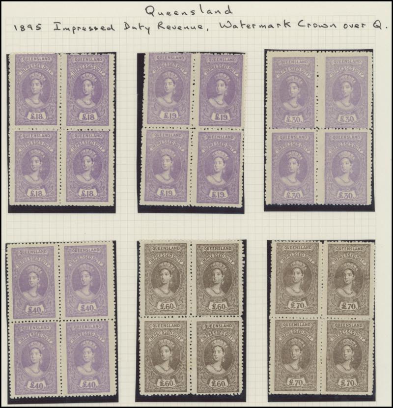 IMPRESSED STAMP DUTY: 1895 QV Chalons on Thick Large Crown/A Wmk paper blocks of 4 for 34 denominations between 3d blue and £500