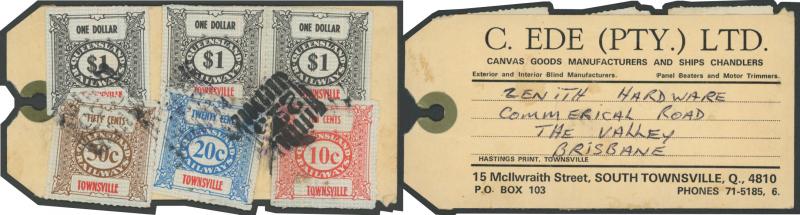 untidy Numeral-in-Vertical-Bars '225' cancels to C Ede Pty Ltd Canvas Goods Manufacturers & Ships Chandlers (South Townsville) parcel tag to Brisbane, a couple of minor blemishes. (Image1) (Image2)