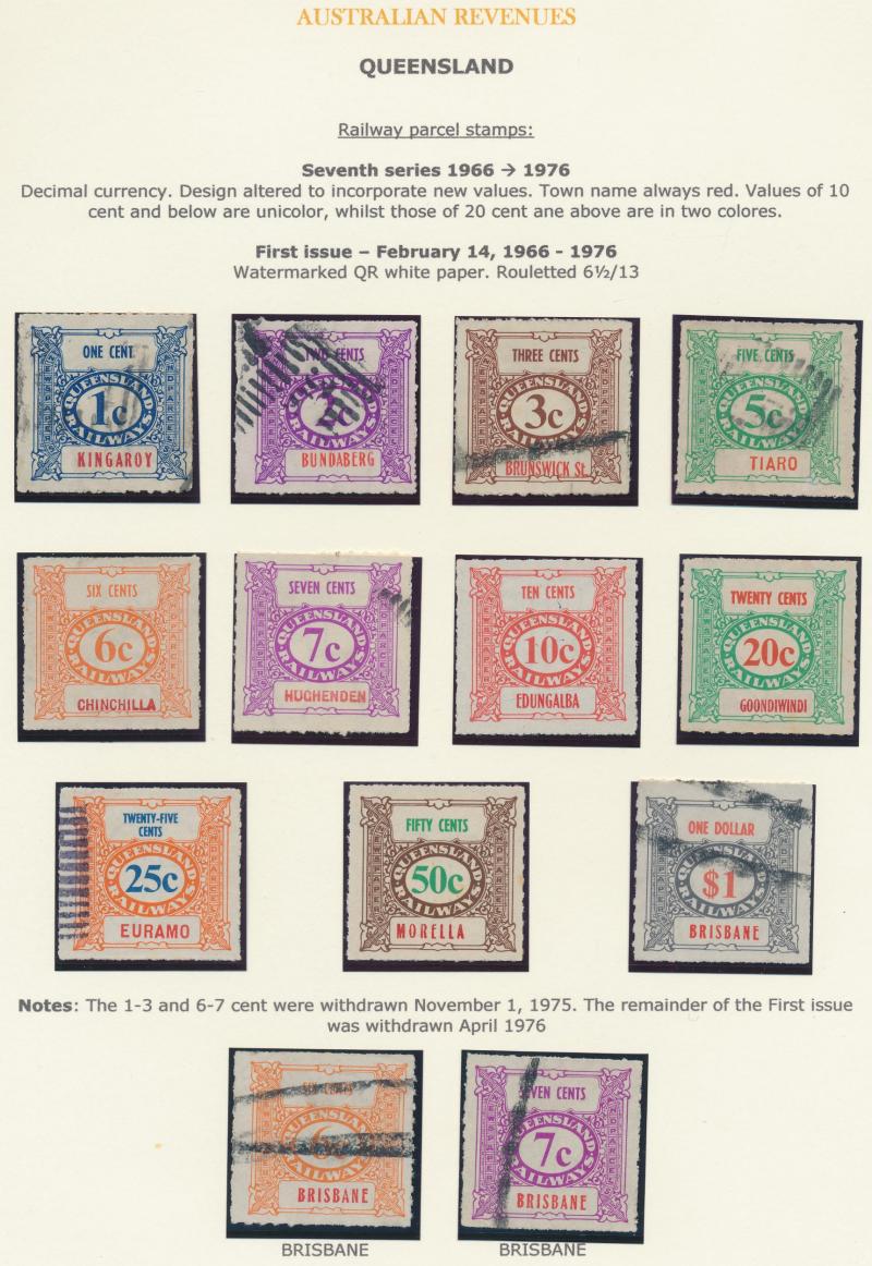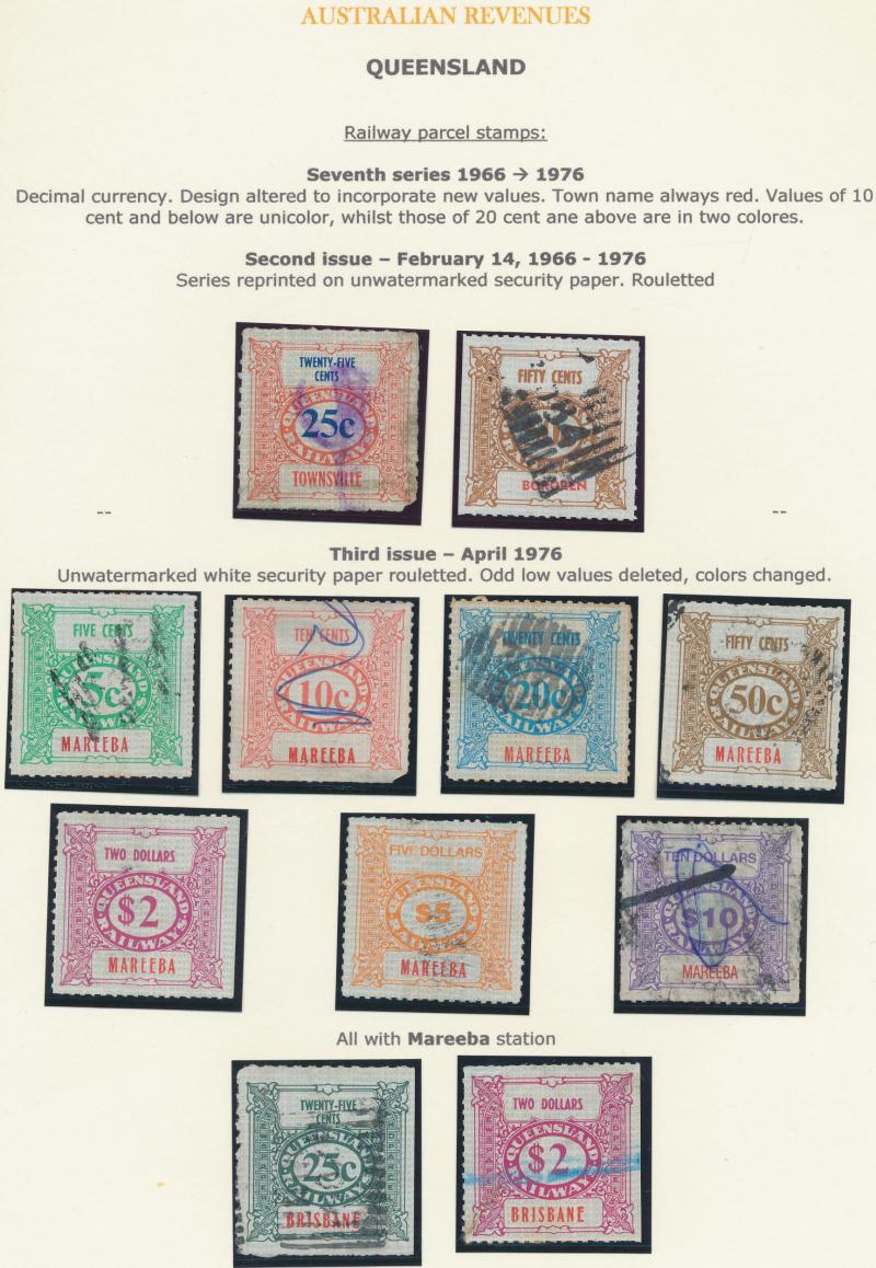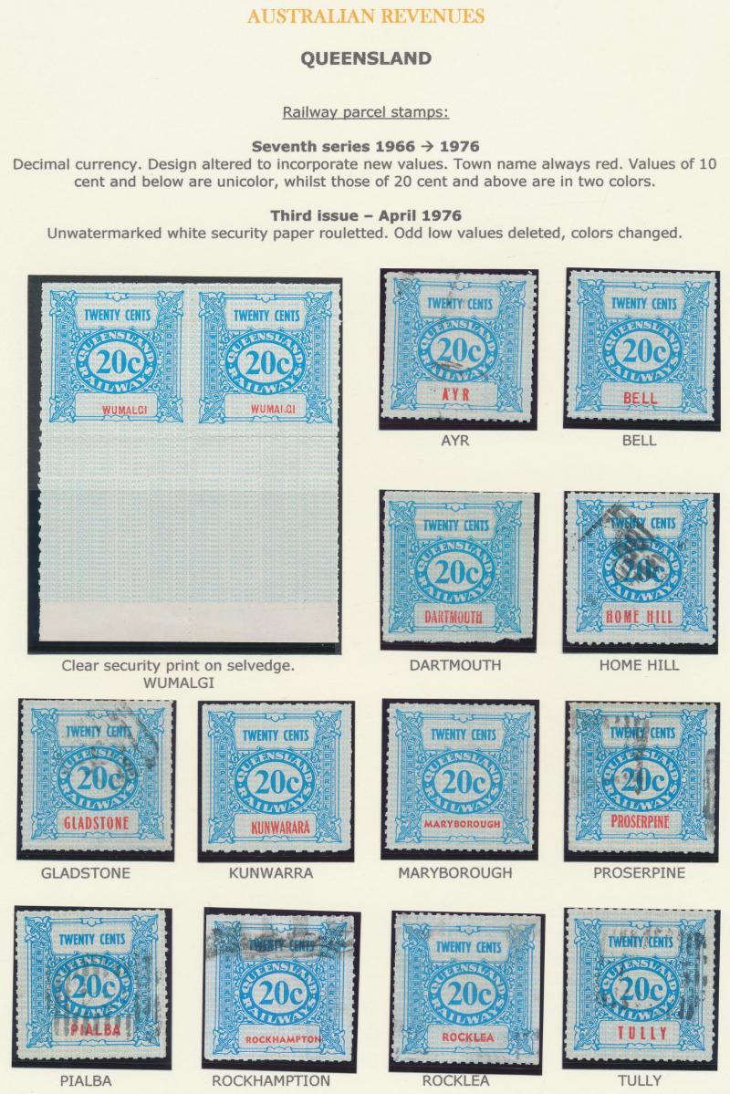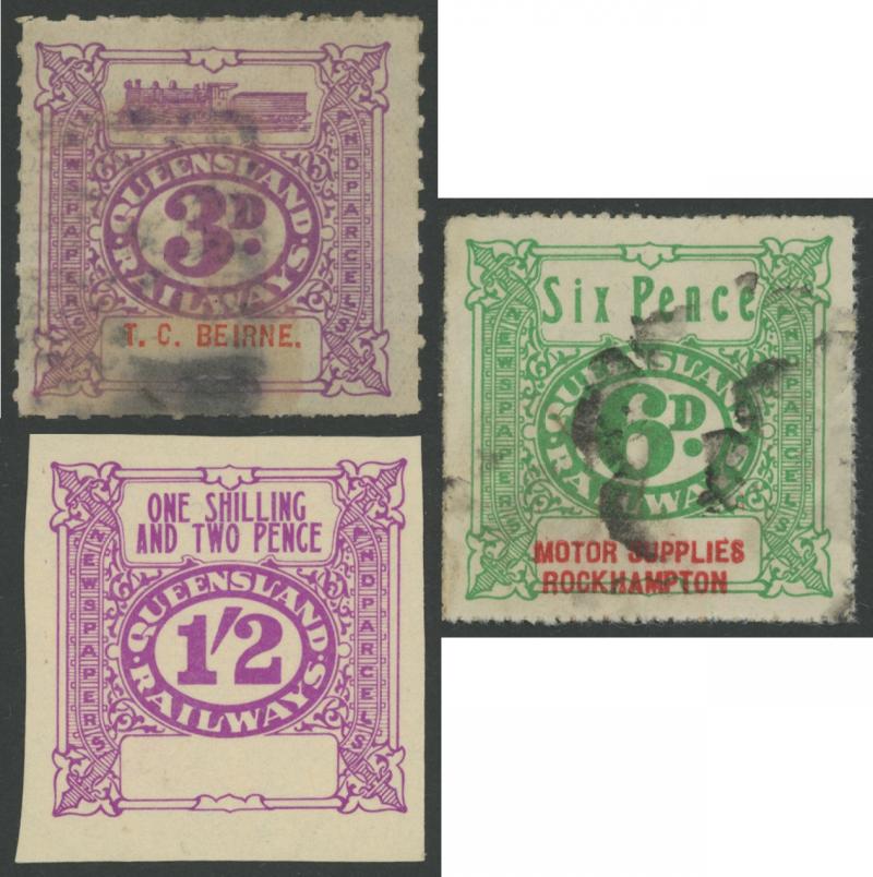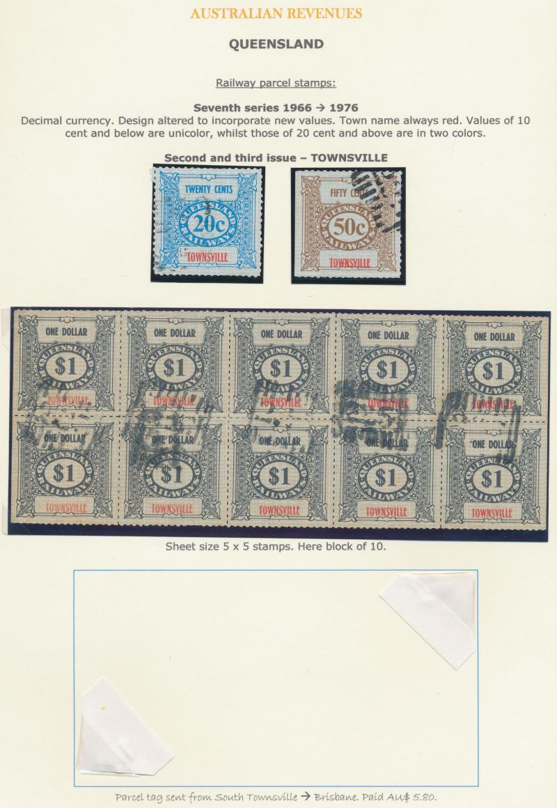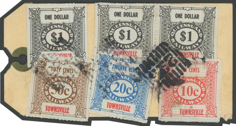 RAILWAY STAMPS: 1970s Security Underprint 'TOWNSVILLE' 10c orange, 20c blue, 50c brown (corner fault) & $1 black tied by slightly