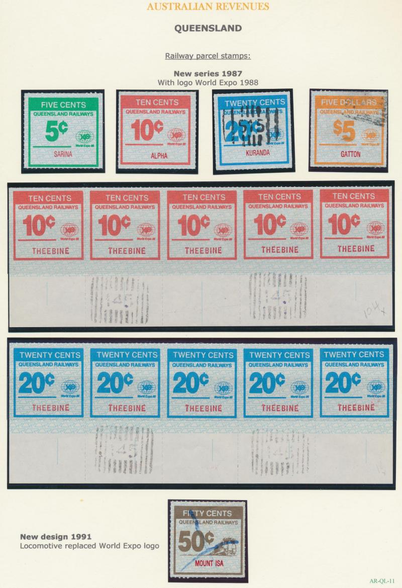 to $10 noted $1 'TOWNSVILLE' block of 10 (5x2) used, 5c 'Repco Auto Parts Townsville' * and a range of stations including 'WUMALGI' (20c pair with huge margins at base *) & 'KUNWARARA', 1987 Expo 10c orange & 20c blue horizontal strips with