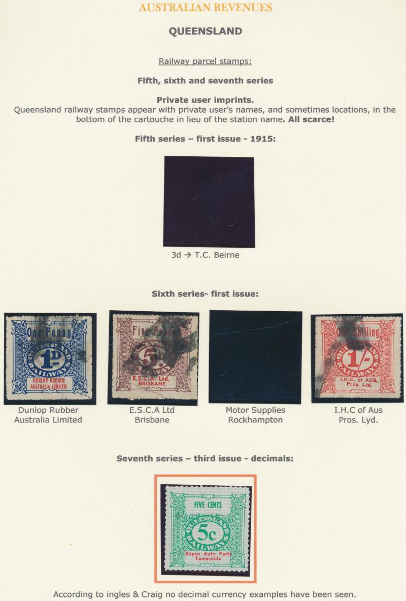 RAILWAY STAMPS: Small selection with a few earlies up to 5/- then 1921 QR Wmk Rouletted 3d with 'T.C.BEIRNE' company name, 1927 1/-