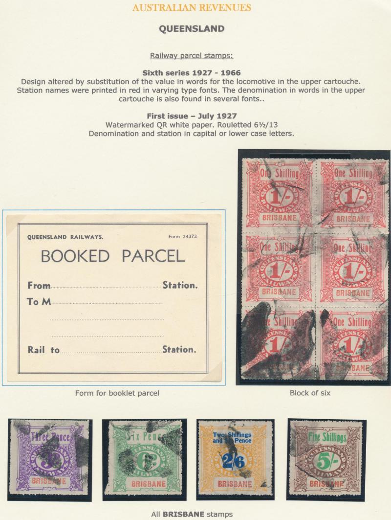 orange 'BRISBANE' block of 6 and 2/6d & 5/- singles used plus Imperforate 'Golden Casket' 1/2d violet unused, 1d 'DUNLOP RUBBER', 5d 'E.S.C.A. Ltd' (closed tear), 6d 'MOTOR SUPPLIES ROCKHAMPTON' & 1/- 'I.H.C.of AUS' all used, 1966-77 Decimals values