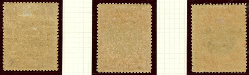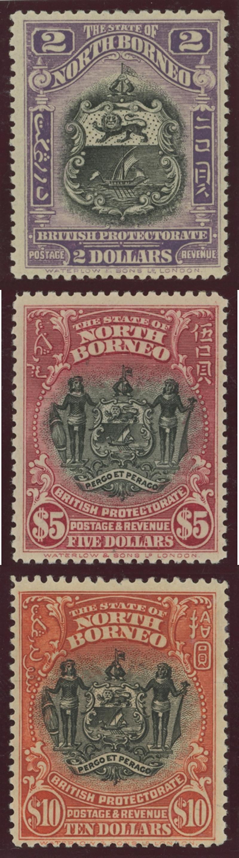 the $10 unusually well-centred, a little minor gum tropicalisation, the $2 with a small aging mark, the $5 bright purple no gum & $5 dull purple with small hinge thin, Cat £1375.