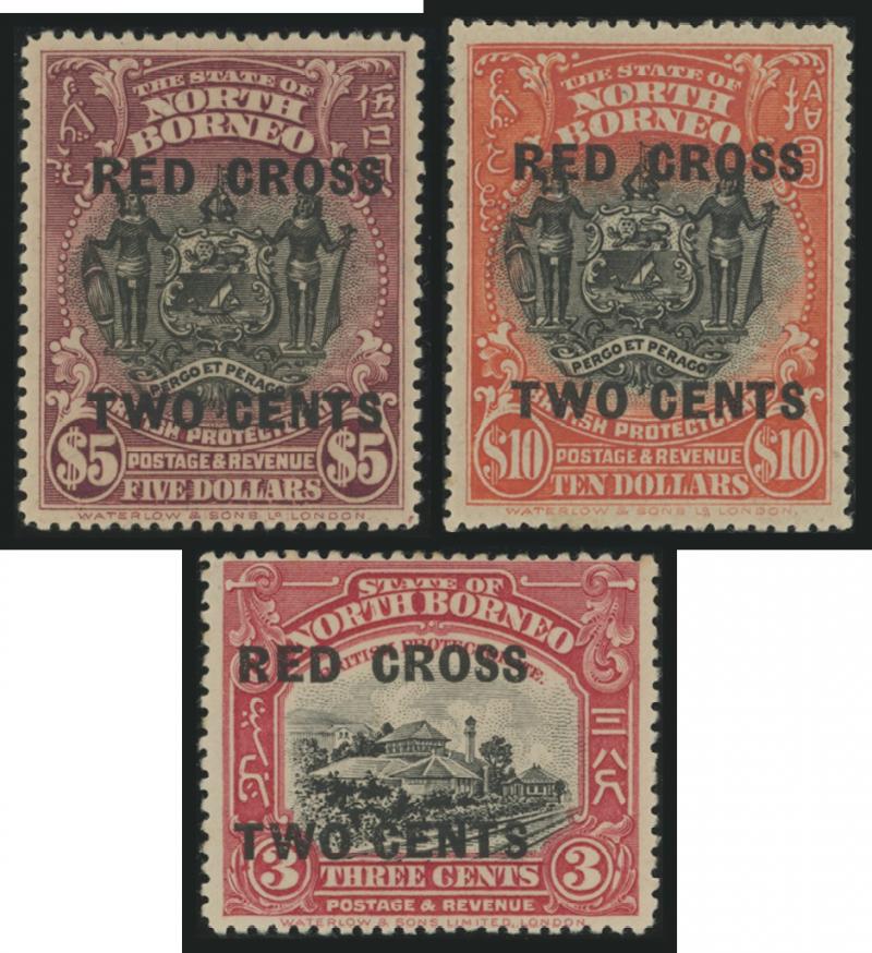 large-part Sandakan cds cancels in red, the last with small part cds in black, Cat £450. (3) (Image1) (Image2)