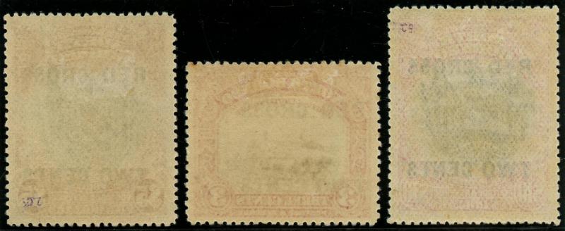 1890-92 Surcharges on Arms in red on 25c indigo 'Two/Cents.', 'Eight/Cents.' and '8/Cents.' SG 51, 52 & 65, the first two with